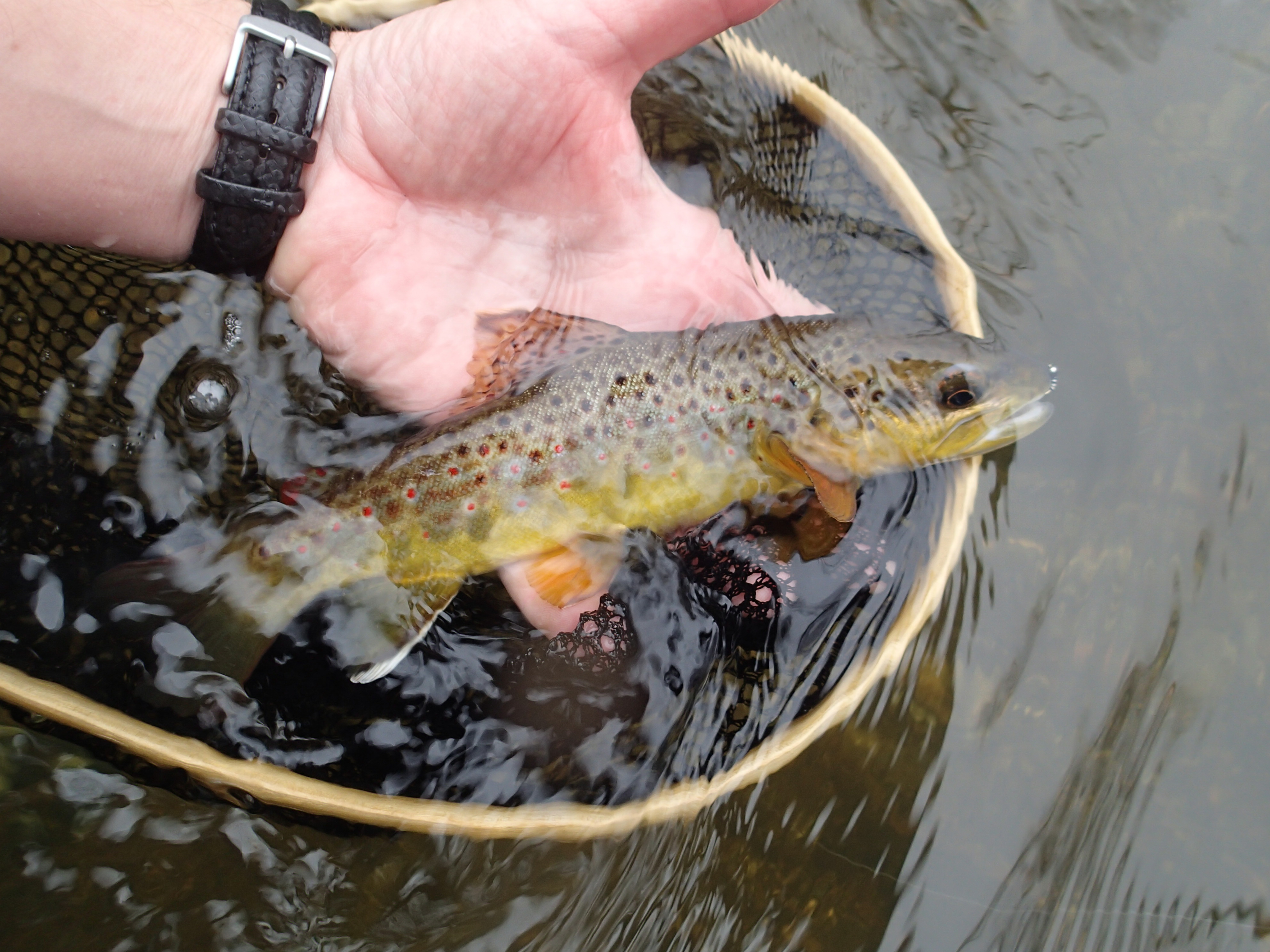 I have shifted almost completely away from dry flies, fishing small (size 18 and 20) zebra midges mostly. This pattern was extremely effective the first two weeks of December, including some days with water temps in the high 30’s. Other small midgelike patterns have shown some promise as well. You can see my go-to fly so far this winter if you zoom in on this trout…